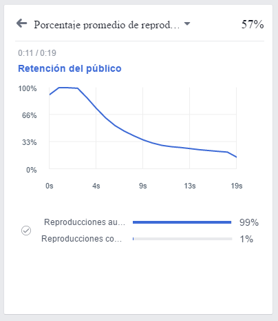 ¡Esta métrica es clave! Te va a indicar el porcentaje de retención del público desde el comienzo de tu video en adelante (podés ver cómo tristemente va disminuyendo la atención según pasan los segundos...).